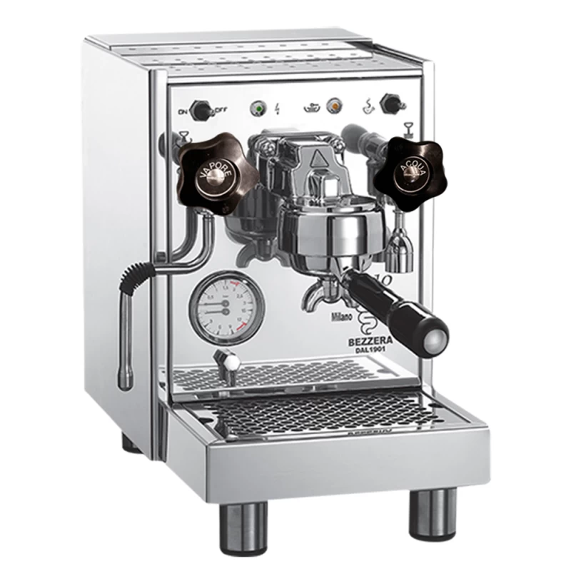 Die Bezzera BZ10S hat ein sehr gutes Preis- Leistungs- Verhältnis und ist daher die ideale Maschine für Einsteiger und Kaffeeliebhaber. Die zweikreisige Siebträgermaschine hat Drehventile und eine sehr klassische Optik. Der Frischwassertank umfasst drei Liter, der Kupferkessel 1,5 Liter. Sehr überzeugend ist die schnelle Aufheizzeit: in etwa 12 Minuten ist die Maschine dank der Brühgruppen- Heizung einsatzbereit.