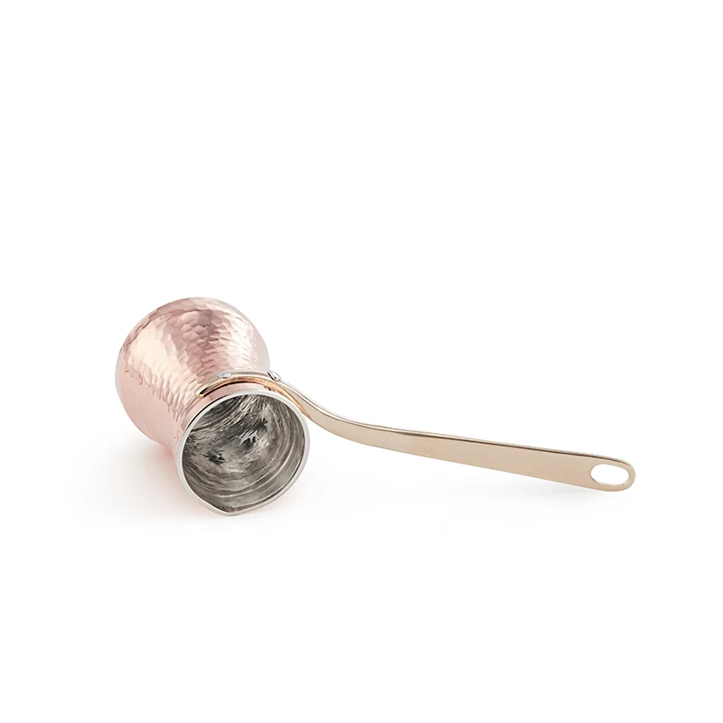 Mit den Cezves vom türkischen Qualitätshersteller Soy aus Istanbul lässt sich feiner Mokka in seinem vollen Aromaspektrum genießen. Die kleinen, aus 1,5 mm dickem Kupfer bestehenden Kaffeekännchen werden handgefertigt. Der aus einer speziellen Bronzelegierung bestehende Handgriff weist wärmeisoliernde Eigenschaften auf, sodass er beim Brühen nicht zu heiß wird. Das Äußere der Kännchen ist von einer Hammerschlagoptik überzogen und wirkt äußerst hochwertig, das Innere ist mit edlem Silber beschichtet.